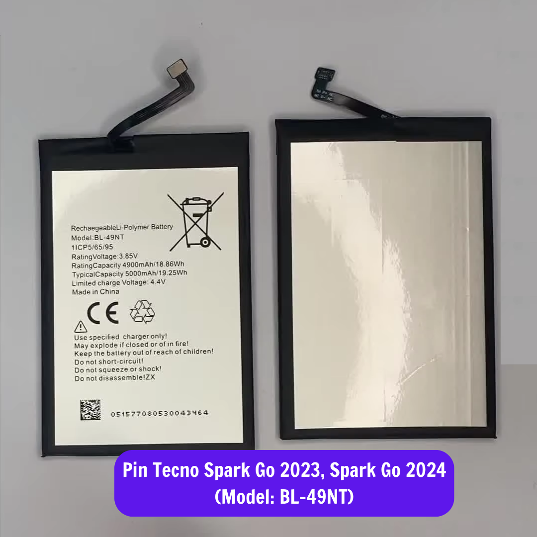 Chúng tôi chỉ sử dụng pin thay thế chất lượng cao, chuẩn mã BL-49NT, tương thích hoàn hảo với Tecno Spark Go 2023 và Spark Go 2024, đảm bảo dung lượng chuẩn 5000mAh và độ bền tối ưu.